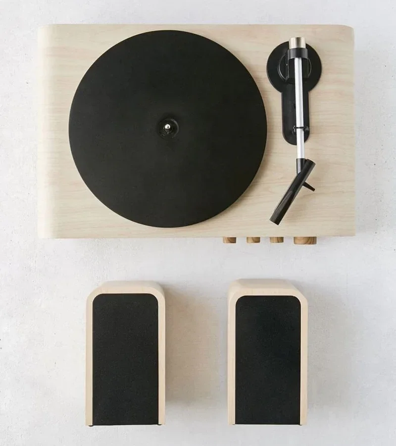 Inclus : une platine Gig par Crosley, 2 haut-parleurs, un tapis antidérapant pour tourne-disque, un adaptateur pour 45 tours tr/min, un câble d'entrée auxiliaire de 3.5mm et un adaptateur électrique