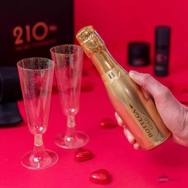 Les flûtes de champagne ? Le bandeau en satin ? Bien sûr, vous pouvez aussi offrir cette box pour l'anniversaire ou le Noël de votre amoureux.