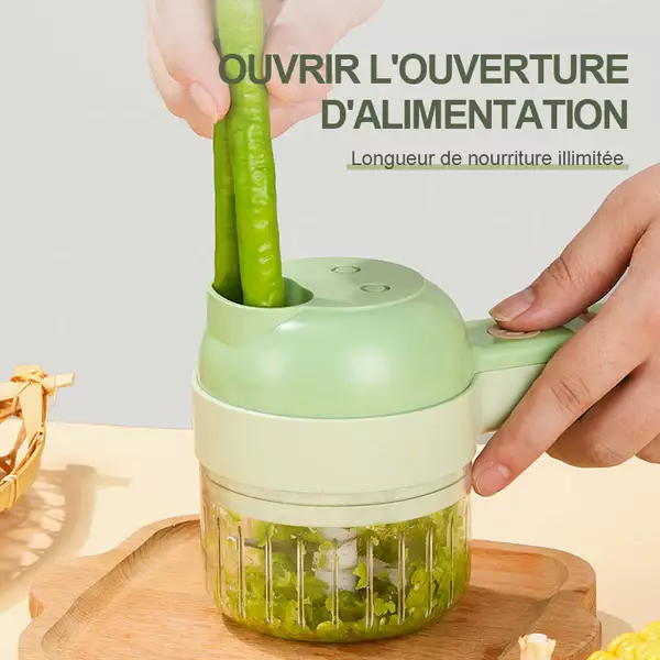 Plus longtemps : port d'alimentation ouvert, longueur illimitée d'ingrédients, aliments longs en une seule étape, pas besoin de changer de couteaux.