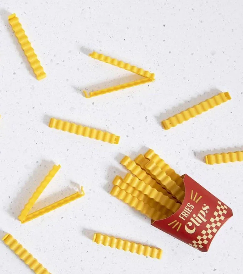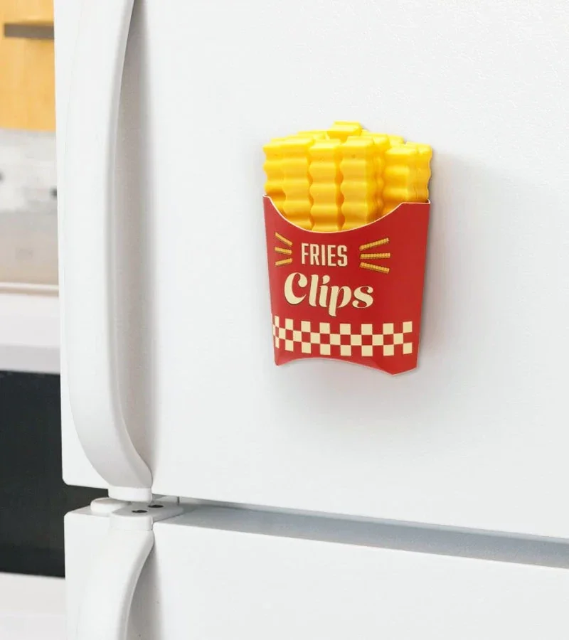 On connaît la musique : on ouvre un paquet de chips, on ne le finit pas et le lendemain, les chips sont molles et nulles. Ces fries clip viennent en aide à tes chips et tout autres sachets en permettant de les fermer et de les garder un maximum de temps au frais. Et comme ce sont des aimants, tu peux les coller sur ton frigo, afin de toujours les avoir à portée de main. Pratique non ?
