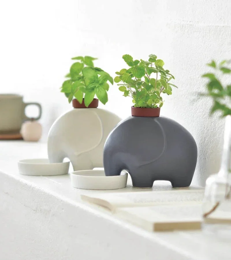 Avoir un éléphant de taille réelle chez soi, c'est impossible. Mais avoir un petit éléphant qui fait pousser des plantes, c'est complètement possible. Eleplant est un éléphant tout rond tout mignon à monter soi-même. Tu y sèmes soit les graines de basilic, soit les graines de menthe et tu laisses l'éléphant utiliser sa trompe pour aspirer l'eau de la soucoupe et irriguer tes plantes.