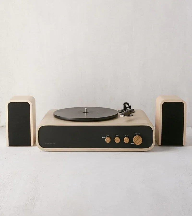 Inclus : une platine Gig par Crosley, 2 haut-parleurs, un tapis antidérapant pour tourne-disque, un adaptateur pour 45 tours tr/min, un câble d'entrée auxiliaire de 3.5mm et un adaptateur électrique